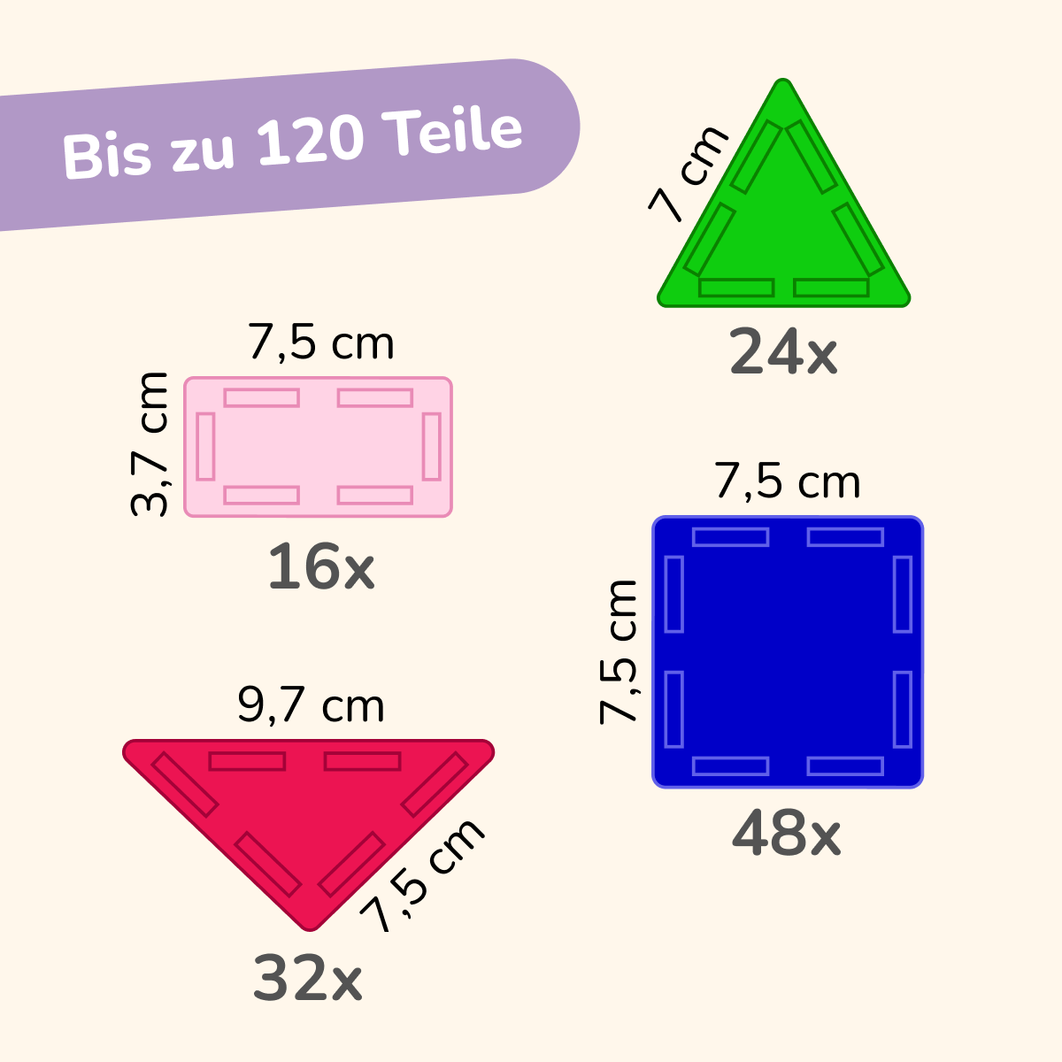 120 magnetic pieces – 2× classic colour sets. Ideal as a starter set for a child or for siblings to discover the world of building together.